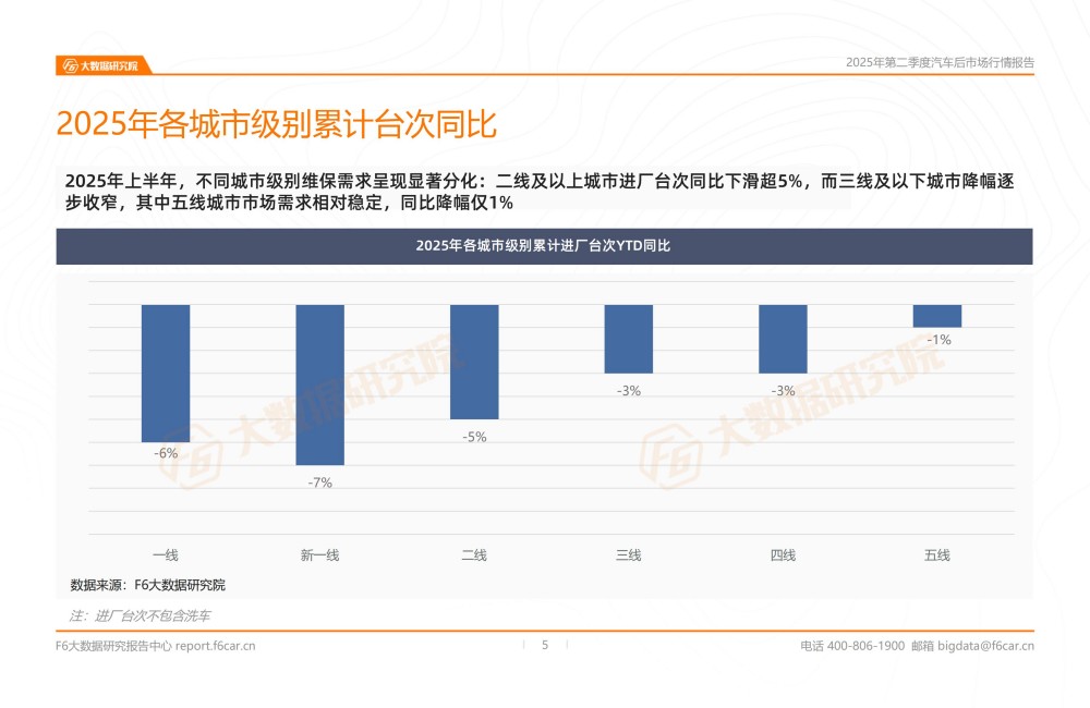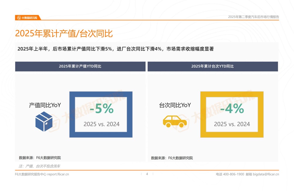 2025年上半年,后市场累计产值同比下滑5%,进厂台次同比下滑4%,市场需求收缩幅度显著