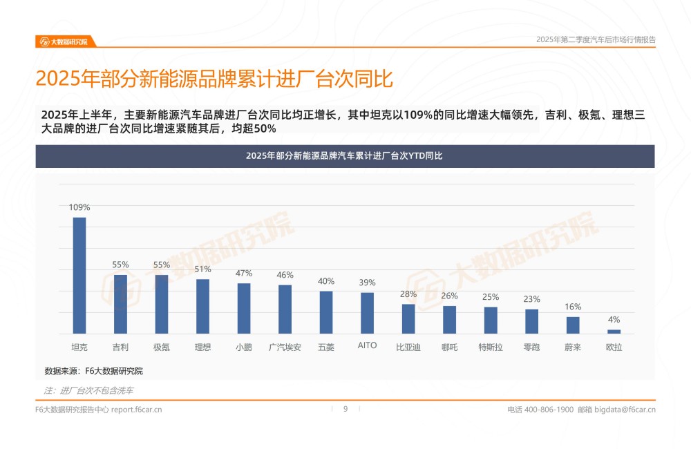 2025年上半年,主要新能源汽车品牌进厂台次同比均正增长,其中坦克以109%的同比增速大幅领先,吉利、极氪、理想三大品牌的进厂台次同比增速紧随其后,均超50%