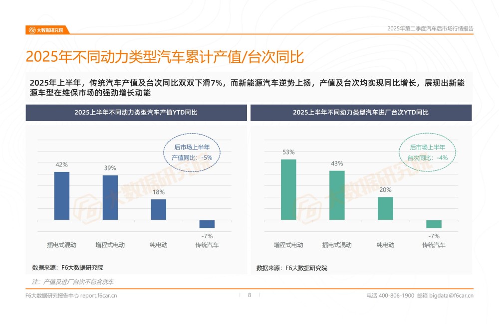 2025年上半年,传统汽车产值及台次同比双双下滑7%,而新能源汽车逆势上扬,产值及台次均实现同比增长,展现出新能源车型在维保市场的强劲增长动能