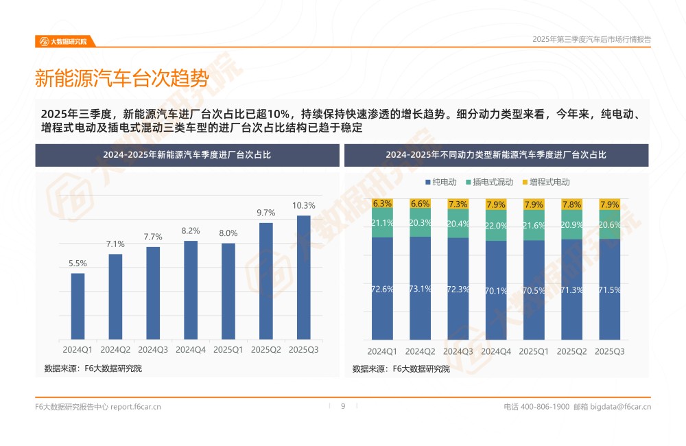 2025年三季度,新能源汽车进厂台次占比已突破10%,持续保持快速渗透的增长趋势