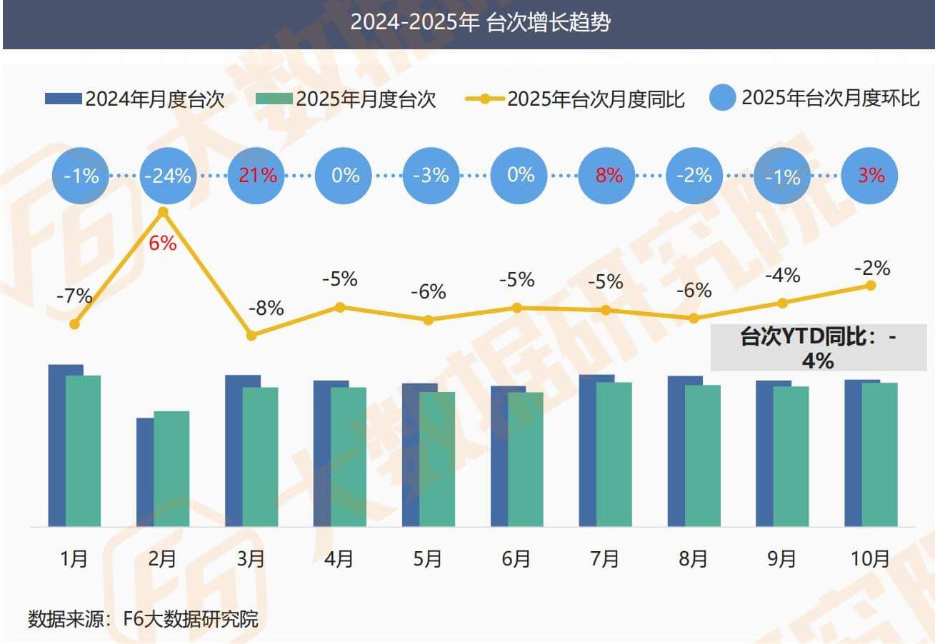 剔除春节因素,2025年后市场各月台次均同比下跌,但当前月度同比降幅已明显收窄,截至10月,累计台次YTD同比下滑4%。