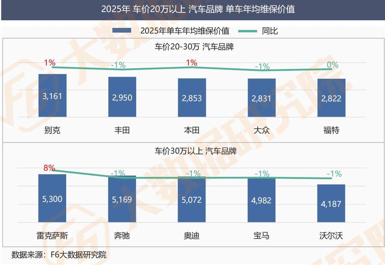 车价20-30万区间,别克车主单车年均维保价值突破3,000元,丰田、本田、大众、福特车主年均维保价值则在2,800-3,000元区间波动,且对比2024年,均保持平稳走势;