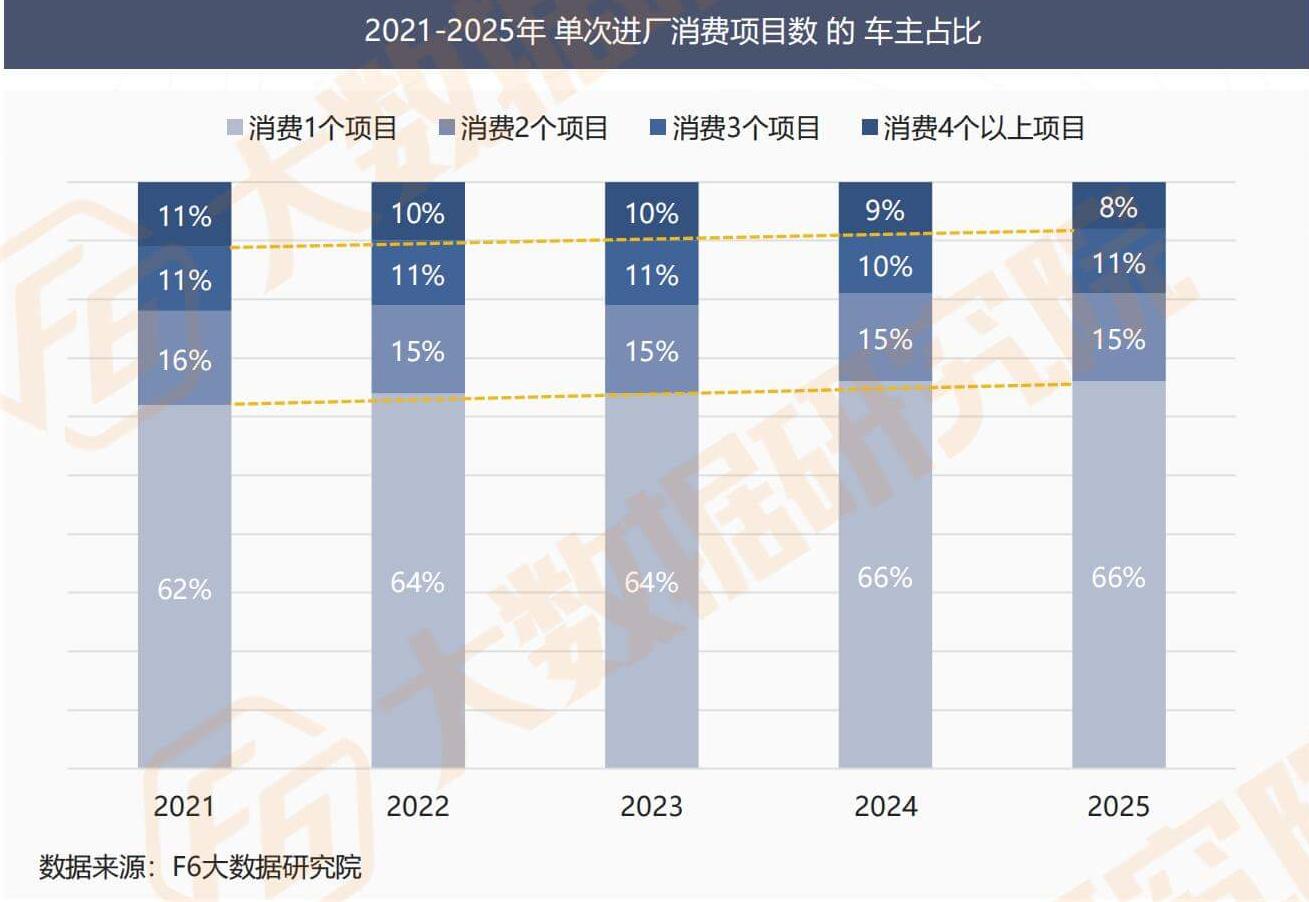 2025年,车主在车辆维保过程中的消费行为呈现出更明显的“精简化”特征:单次进厂消费4个及以上项目的车主占比进一步降至8%,这一数据不仅创下新低,更延续了近三年来持续下滑的走势,反映出多项目打包消费的模式正逐渐被车主摒弃。