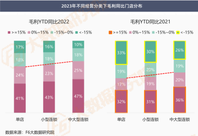 相较2022年,2023年单店中65%的门店实现毛利增长,小型连锁门店中66%门店毛利增长,而中大型连锁门店中72%门店毛利增长,较单店高出7个百分点。