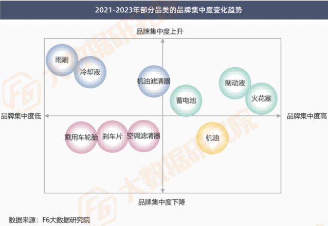 雨刷、冷却液等配件呈品牌集中化发展趋势,而机油、乘用车轮胎等分散发展