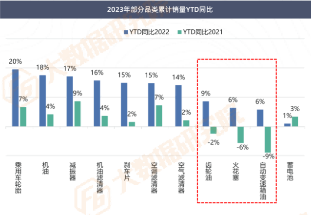 2023年齿轮油、自动变速箱油、火花塞品类销量仍未恢复至2021年水平